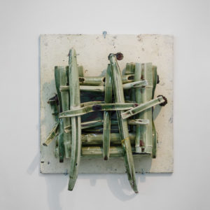 This contradiction can also be seen in the Bamboo Chairs series, in which Chinese porcelain bamboo takes the form of a chair. The viewer can neither anticipate nor judge whether it is solid or flexible. Like Piercing Game, Bamboo Chairs returns to echo the dialectic of the Ancient East. Seemingly poetic, yet the pieces are full of contradictions, uncertainties, doubts and a comic restlessness that the artist delivers with apprehension. These ceramic bamboos are presented to us like cultural relics from a museum, similar to ancient Chinese musical instruments or tools from a workshop. They look familiar to us but no one is able to determine their origin and function. These post-modern “false creations” are part of history, the one that we persist in wanting to restore. This time that we connect to myths and legends with staples, wishing to progress but without knowing where to go, ended up repairing the past with our noses kept to the grindstone.