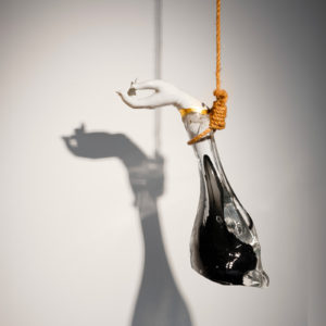 This “reinvented statue”, which consists of several colored glass bubbles, is no longer presented in a sacred place, but now rests gracefully on a stainless steel butcher’s table. From a butcher’s point of view, the exhibition space could be considered a “Buddha butcher shop”. Hanging from the ceiling of this butcher shop, a glass ham becoming the arm of the statue symbolizes the gesture of Bodhisattva. This hand which for thousands of years pointed upwards, now points downward to the earth. This mischievous destruction, undermining the norms and conventions of its own culture: let’s call it liberation.