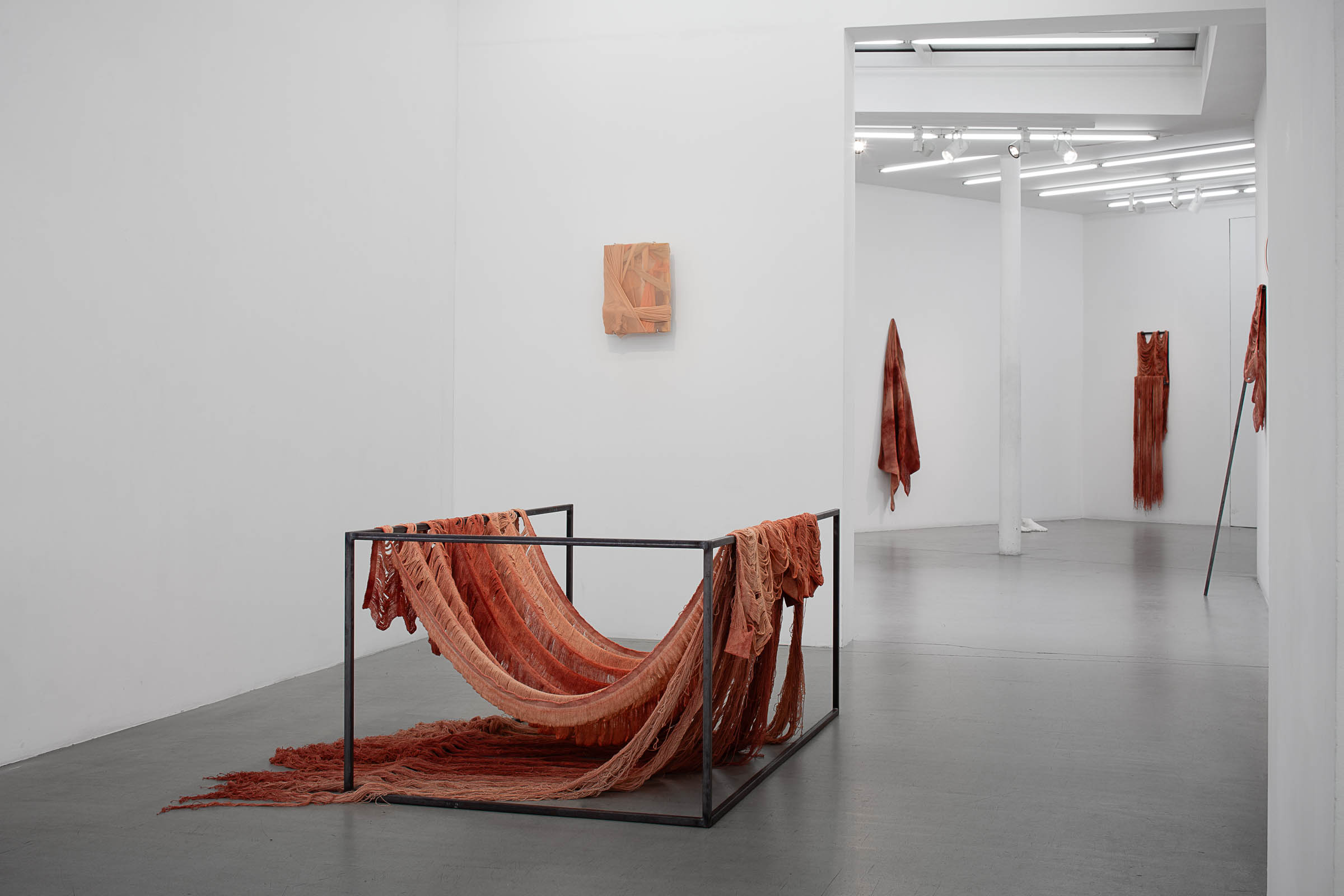The contact or the deposition (in the Christological sense) of the flesh-fabrics on the structures takes on different meanings: hanging laundry, laid tablecloth, drawn shroud, crucified body (the body is both omnipresent and fundamentally absent)… but they can also detach themselves to join the wall or be suspended from the ceiling. From then on, this skin torn from its refuge (bodily or theatrical), falling into the void and defying gravity, resurrects an archetypal image of Western culture and of 16th-century anatomical science: the flayed figure presented by Juan Valverde de Amusco in his illustrated treatise Historia de la composicion del cuerpo humano (published in Rome in 1556). This figure who tears off his own envelope, holding his skin in his right hand, a dissection knife in his left, thus exhibiting his flesh-body. It would find its source of inspiration in the figure of Saint Bartholomew (who presents himself in exactly the same way, his own skin in his left hand) painted by Michelangelo between 1534 and 1541 in the fresco of the Last Judgment in the Sistine Chapel (Rome). It is remarkable that Golnaz Payani manages to intervene in such an ancient iconography of the flayed figure through textile material alone, without any other artifice, except for her way of tinting the fabric with iron oxide. The latter, which gives Golnaz Payani’s draperies their troubling, living, and sanguine appearance, is intended as an organic artifice; whether it refers to the reddish water of sources such as the Rio Tinto, near Nerva in Spain, where the concentration of iron oxide is high, or to the presence of iron in the human body and blood⁴.