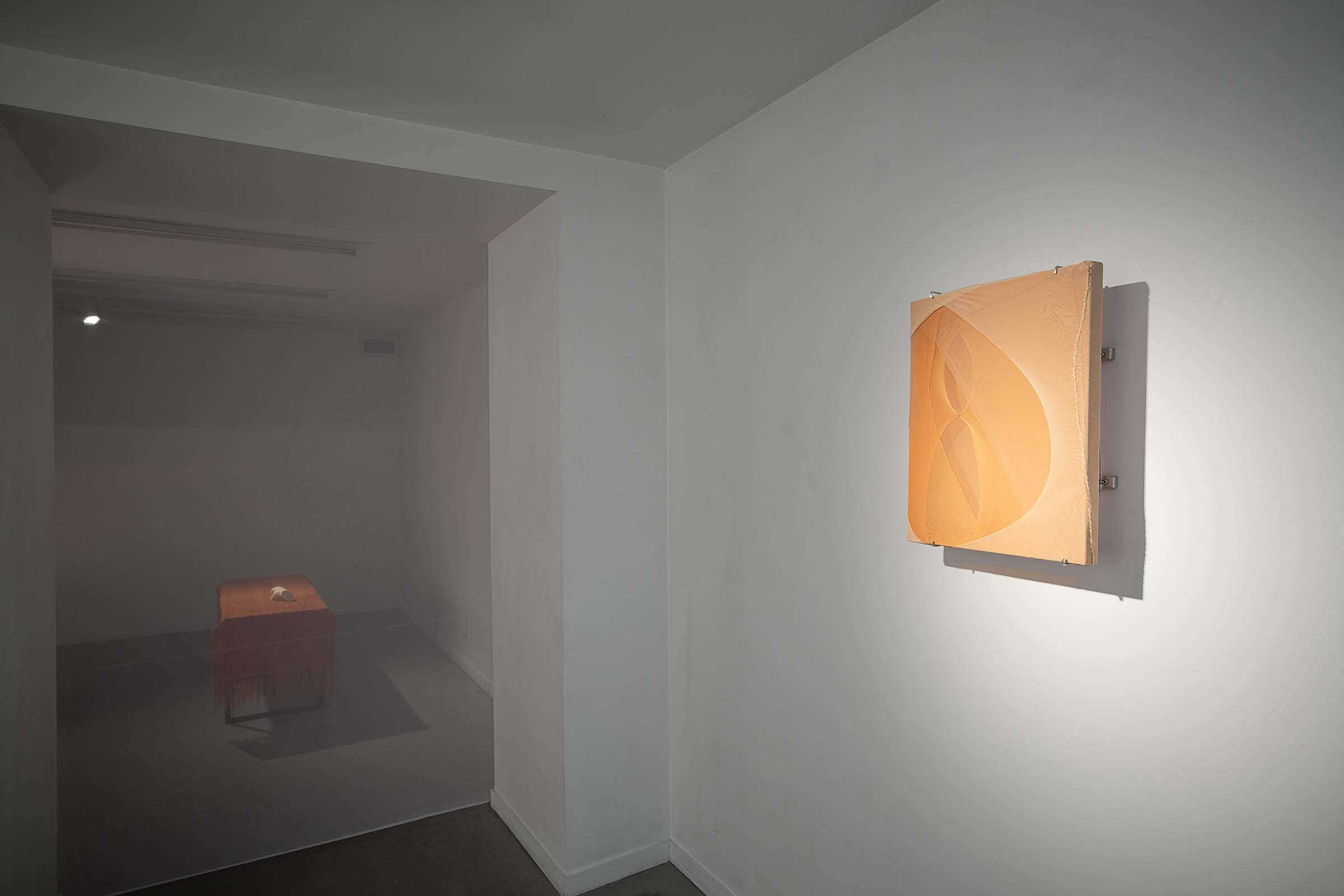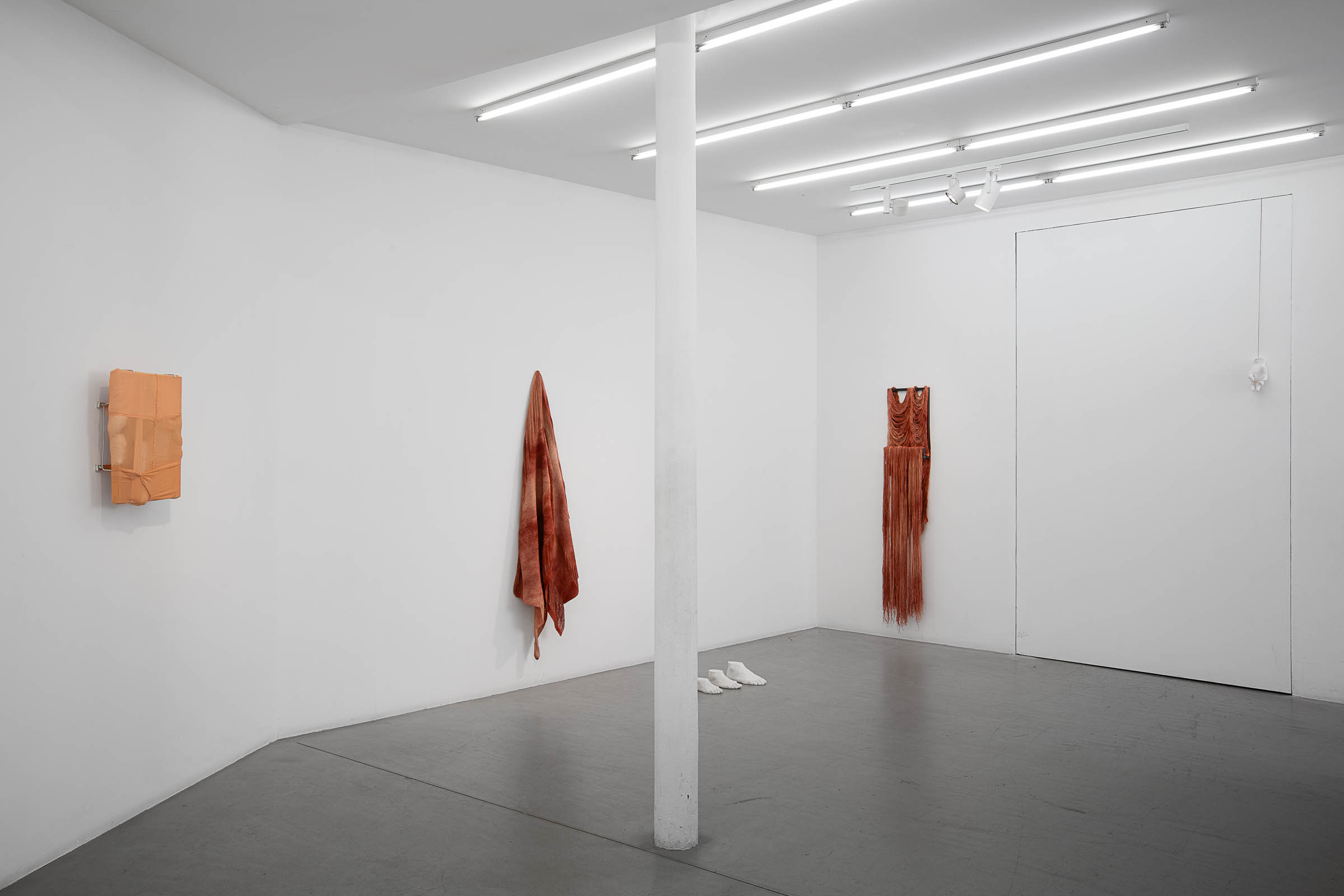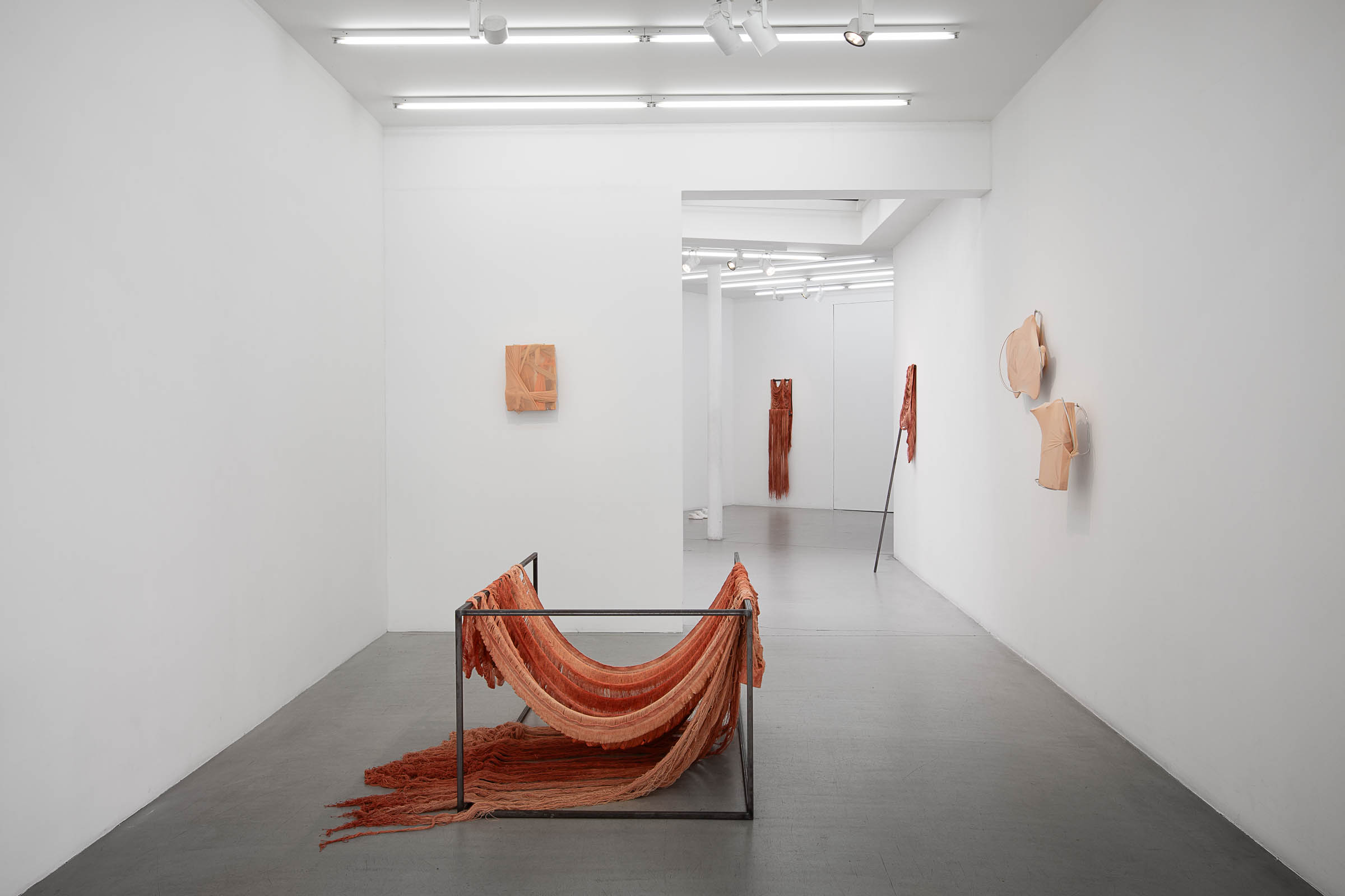 The installation devices (with their metal frames) through which Golnaz Payani allows us to see and touch her skin-sculptures extend the domain of visual arts and anatomical spectacle to that of a theatrical stage intended for ghost actors. In this case, the casts of feet and hands scattered among the lines of the metal structures and the flesh-fabrics (produced by the artist from elderly people encountered during her recent residency and exhibition in Thouars) reinforce this impression of a muted, faceless staging. Relics, ex-votos, body-fragments that alternately evoke desire and the failure to form a body. The metal structures operate both through mise en abyme (the flesh-fabric grafts itself onto them, doubling the erasure of the limit between inside and outside), through distancing (giving us the impression that the flesh-fabric could not be carried by human hands), and finally through reconfiguration (the metal structure gives a new form to the formless flesh-fabric). These three-dimensional structures, both displays of the unshowable and imaginary cages, persistently recall other images in which the second and third dimensions seem to intertwine, notably the many paintings of Francis Bacon in which flayed figures are inscribed within a double perspective: that of the pictorial field and that of the minimalist structures that enter into it like skeletons of architectural space.