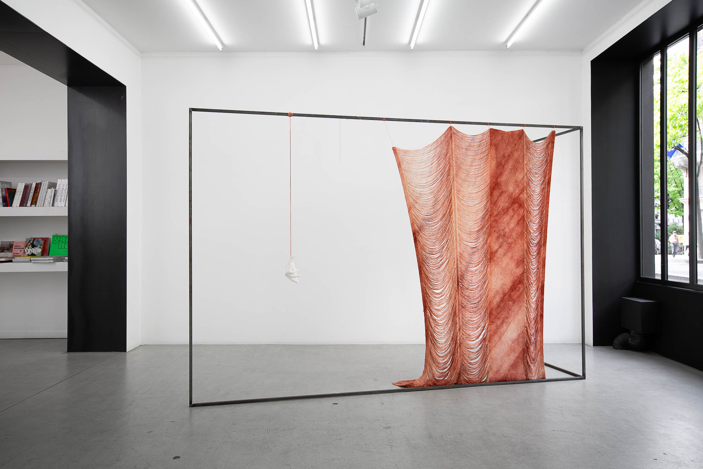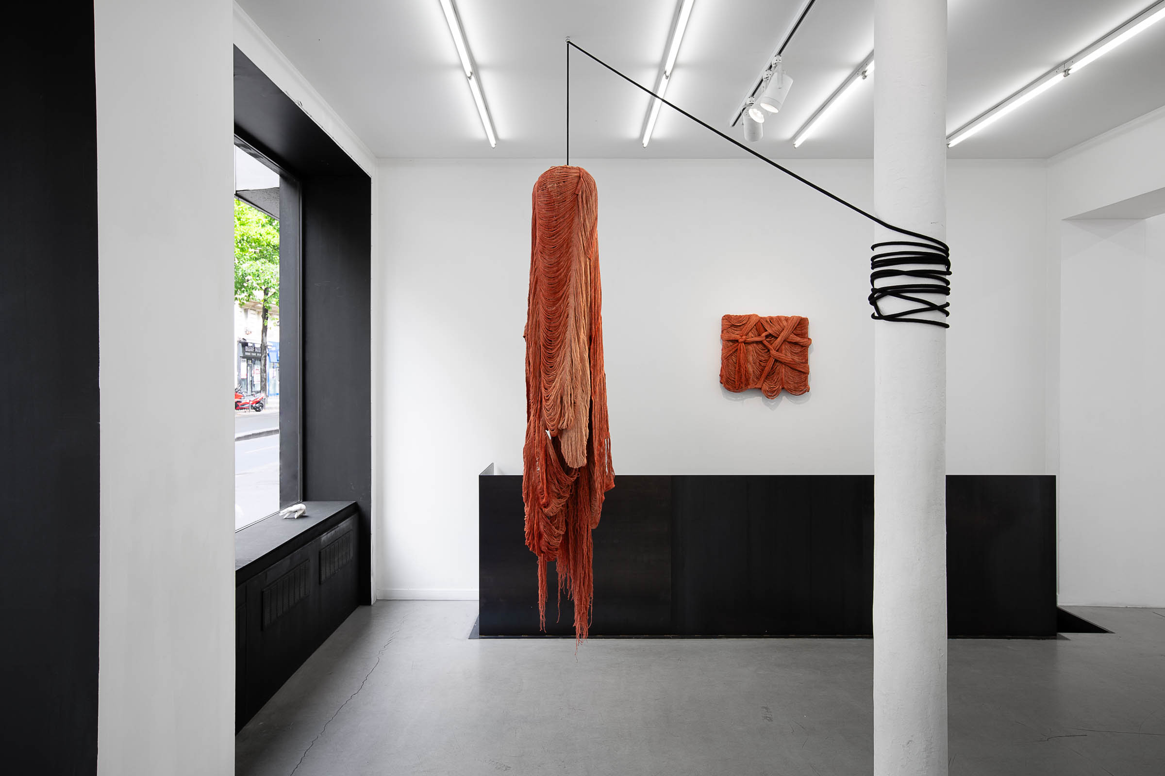 One could say that Golnaz Payani now makes of skin, or of the beyond-skin (as one speaks of the afterlife), a question of life or death… of forms, of their memory and of their action in reality (one could speak of the life and death of the cells of a work of art as of those of a body). It is therefore symptomatic that from a practice of unweaving and decadrage of painting, tapestry, and embroidery, all delimited spaces inherited from the system of Fine Arts, she has moved to the flaying of the body and its skin, torn by the obsession of probing its own entrails, spaces without limit or of absolute limit, that which separates us from ourselves by objectifying our own fragility. As a direct consequence, Golnaz Payani’s works spill beyond the frame, moving from the wall and the hanging rail to the surrounding environment, within a general economy of space that sees her more than ever assume her status as a sculptor; even though her practice is defined beyond the specificity of medium, first and foremost through affects and gestures. In 2022, during her participation in Asia Now in Paris, Golnaz Payani presented a large and imposing black flag, composed of thousands of unweaved threads, enthroned sovereignly in the middle of a public courtyard yet falling like a martyr-body². Something in this depressive anti-monument, a tribute to the Iranian insurrectionary movement “Woman, Life, Freedom”, already hinted at the artist’s new anatomical inclination.