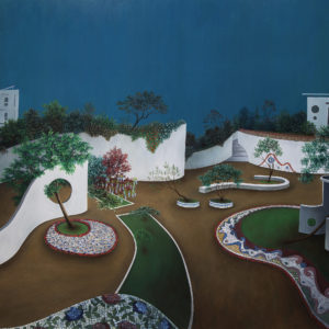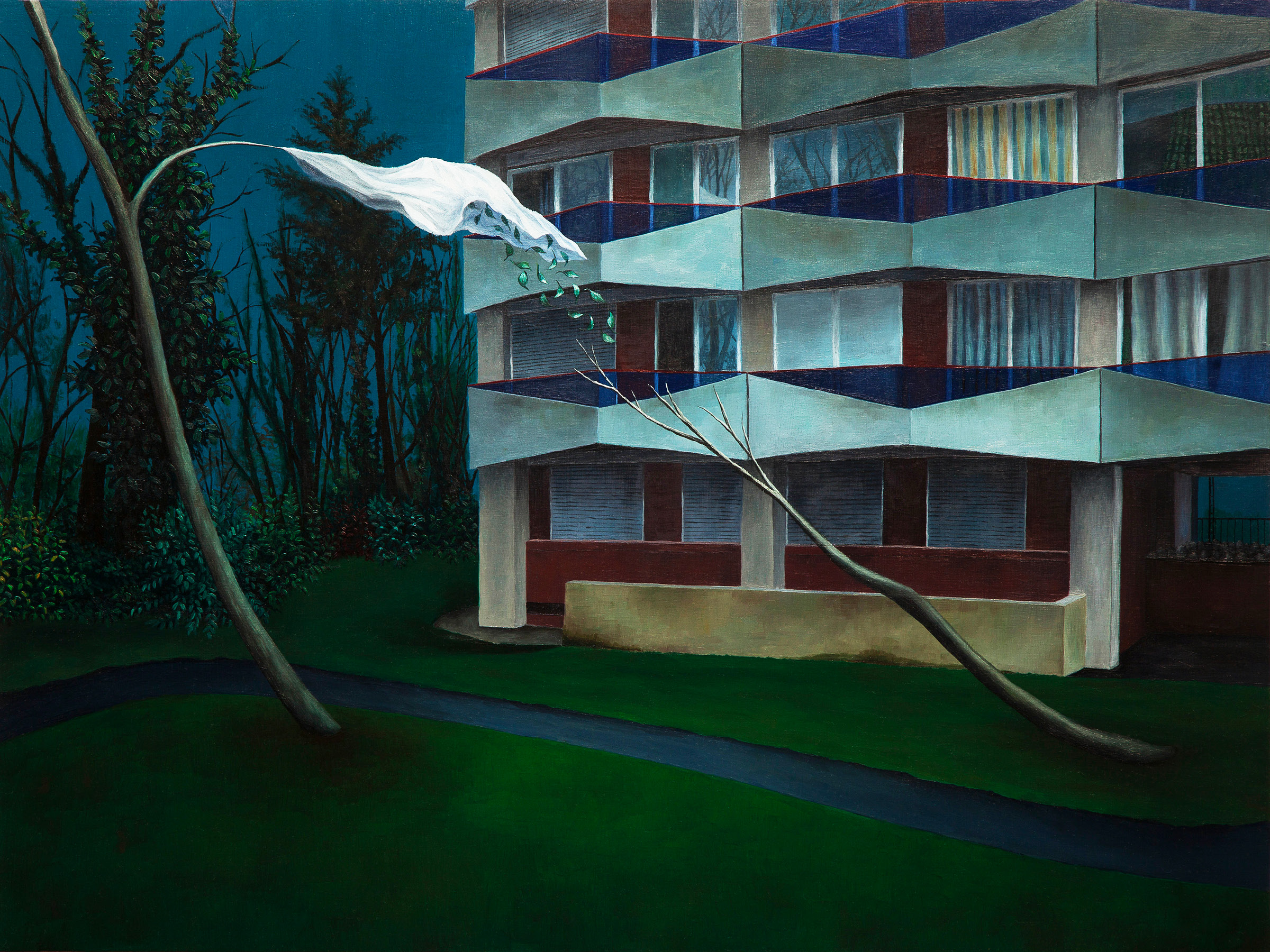 Pour sa première exposition monographique dans un centre d’art, organisée suite à une résidence de deux mois chez 2angles, Dorian Cohen (né en 1987) présente ses Urbanités, de petites huiles sur bois composées de différentes couches de glacis. Dans un style ultra réaliste et détaillé, il peint des façades d’habitats collectifs avec leur jardin en contrebas, et décline des paysages bétonnés rehaussés par une nature artificielle verdoyante. Avant de s’adonner pleinement à l’art, Dorian Cohen a suivi une formation d’ingénieur urbaniste et s’occupait de l’aménagement des villes et des routes départementales de la couronne parisienne. Ses grands formats issus de la série Départ en vacances, initiée en 2015, esquissent des courbes de bretelles d’autoroutes et l’entrelacs des voies du périphérique. Mais ces images, vides de toute présence humaine, ne se limitent pas à retranscrire le regard d’un architecte paysagiste attentif à la structuration de l’espace public. Les toiles de Dorian Cohen prennent parfois des allures plus étranges ou apocalyptiques – le bitume se désintègre et vole en éclats… Ainsi, elles s’enrichissent d’ornements décoratifs (les belles mosaïques d’Unenuit à l’opéra) et s’ouvrent à l’imaginaire avec leurs atmosphères oniriques, entre chien et loup, où la ville et la nature, d’habitude si mornes, s’animent enfin…