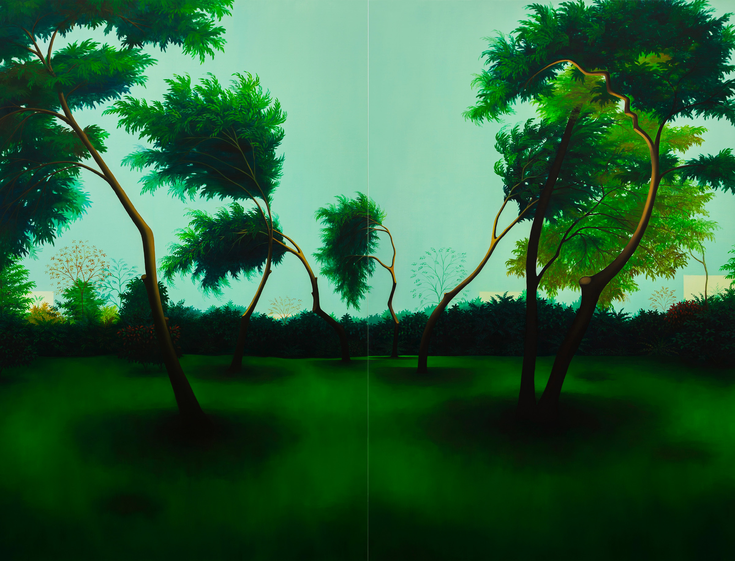 et un idéal de perfection à l’antique – et une admiration pour la rigueur de la touche précise et la mise en scène grandiloquente d’un Poussin, ses paysages aux formats extrêmes (soit très petits, soit très grands) confrontent, dans un jeu presque surréaliste et étrange, des infrastructures autoroutières d’une architecture surprenante à une nature foisonnante, inquiétante, voire hostile.