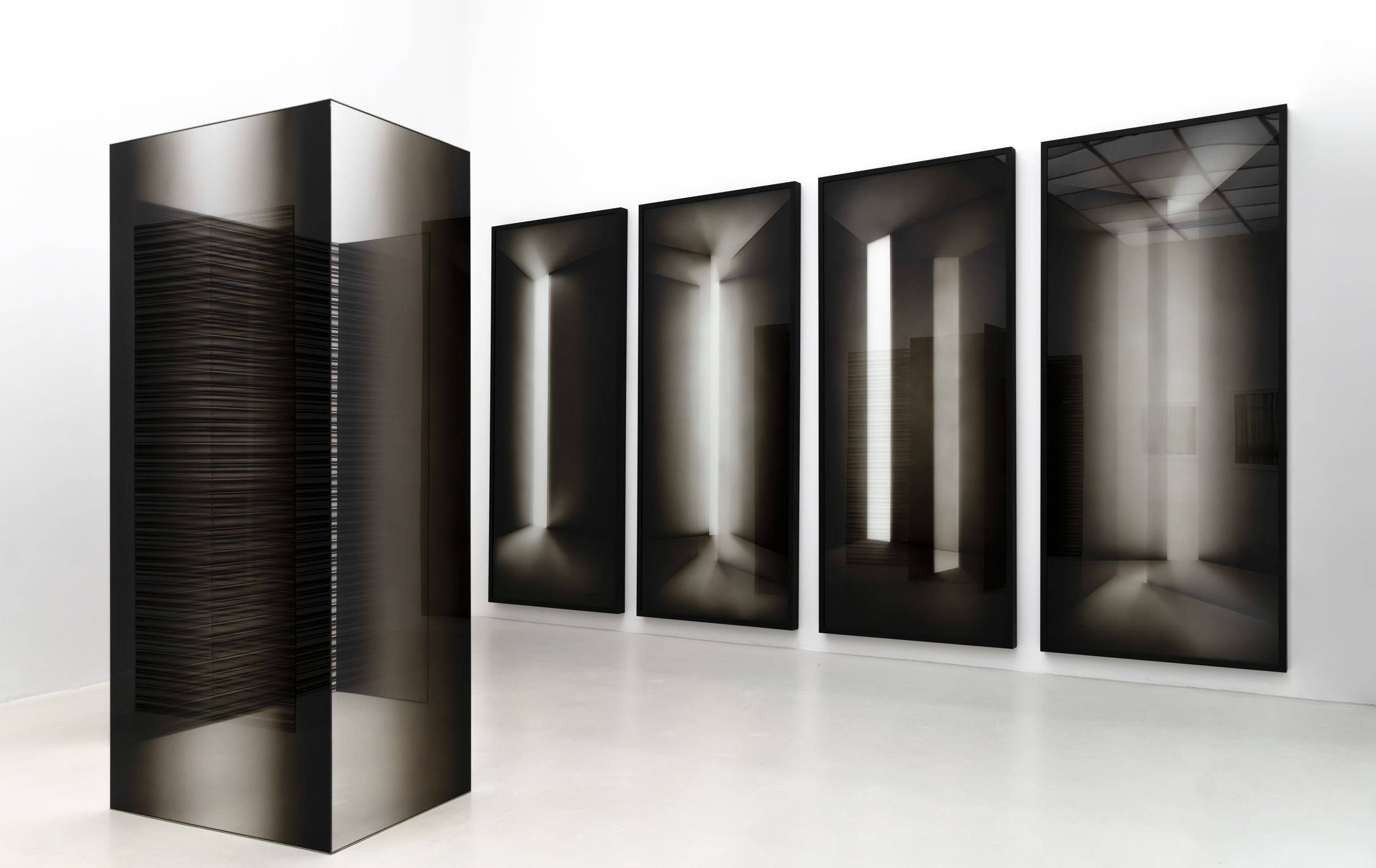 La vitrine, avec ses jeux de reflets qui nous intègrent à l’objet désiré, matérialise un espace médian dont la légèreté et la transparence sont enfin transformées en barrière opaque dans les sculptures Mapp, réalisées en Mortier Adhésif pour Placoplâtre. Face à la précision du geste que l’on retrouve dans ses vanités s’élèvent des monolithes mystérieux, censés peut-être influencer l’évolution de l’espèce humaine. Plus mélancolique que moralisatrice, plus poétique que politique, son œuvre monochrome suspend le temps qui passe. Par-delà la grille s’impose une profondeur qui ouvre l’espace et rend visible ce qui était caché.