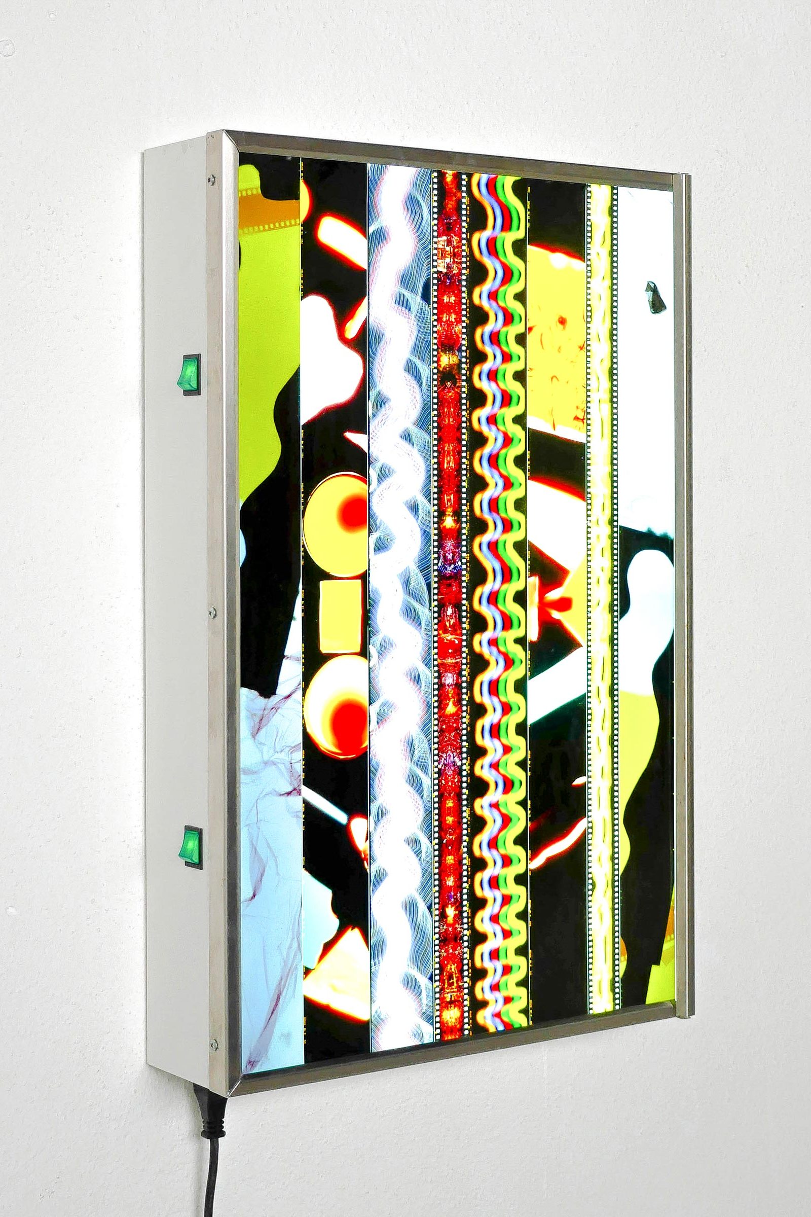 By Bye, 2022, pellicule diapositives 120 et 35 mm, négatoscope, résine époxy, 45,5 x 38 x 13,5 cm