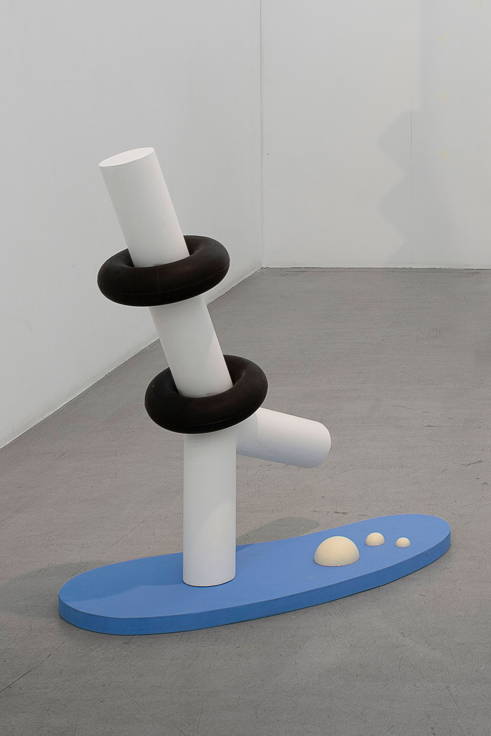 Like their smaller counterparts, the medium-sized sculptures presented in the exhibition are characterized by abstraction with “cartoonish” forms and pop colors, as exemplified by Vagabond (date), where a stone turned pink serves as a base for a metal chain rising upward, stopped at its peak by a bolster with white and black stripes, reminiscent of the prisoner outfits in early Disney cartoons (The Chain Gang, 1930).